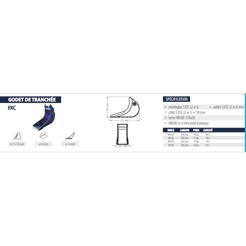 Les godets de la série EKD sont disponible en largeur 250- 300 - 350 - 400mm de largeur.