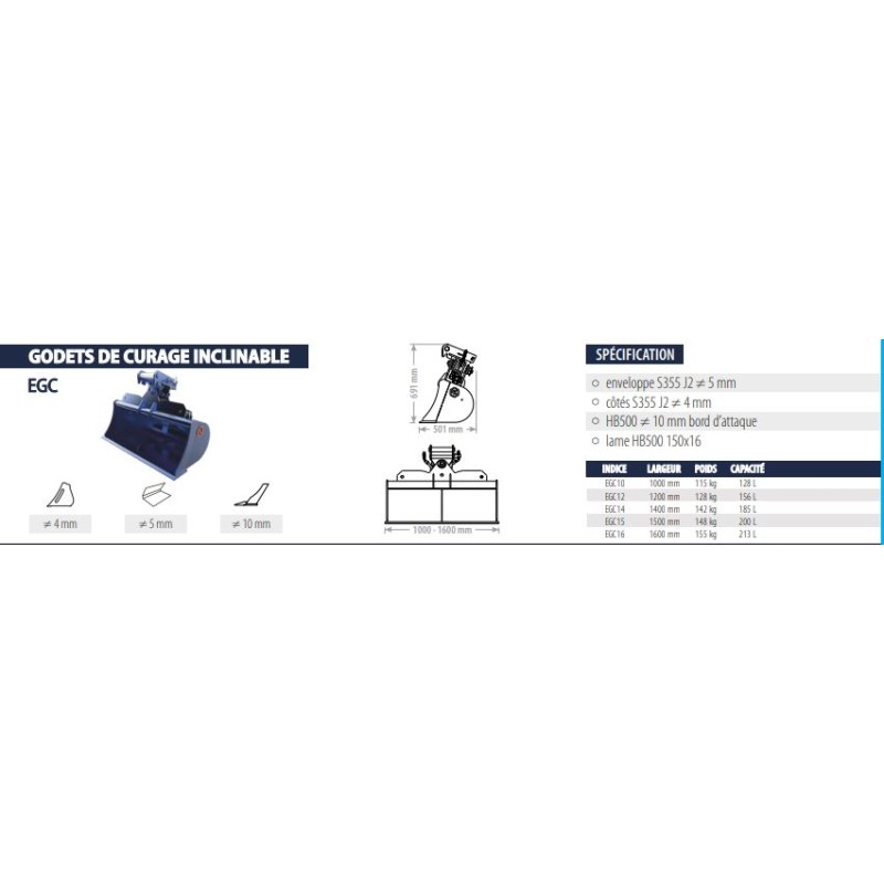 Les godets de la série EGC sont disponible en largeur 1000 - 1200 - 1400 - 1500 et 1600mm de largeur.