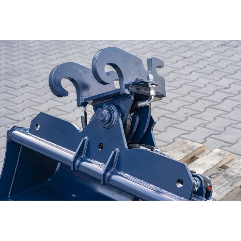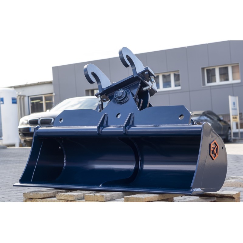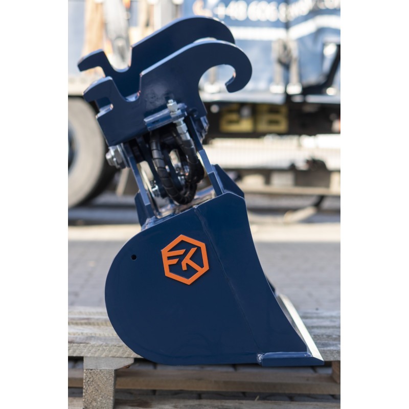 Godet de curage orientable pour pelle 2.5 à 3.5T, 1 vérin à 2 x 45° d'inclinaison avec amortisseur de fin de course.
