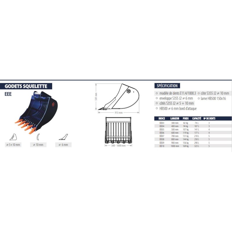 Godet squelette/claire voie largeur 1000mm série EEE pelle 5 à 6T