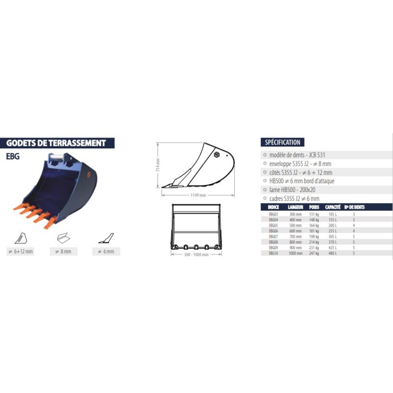 Les godets de la série EEF sont disponible en largeur 300 à 1000mm et de 3 à 5 dents
