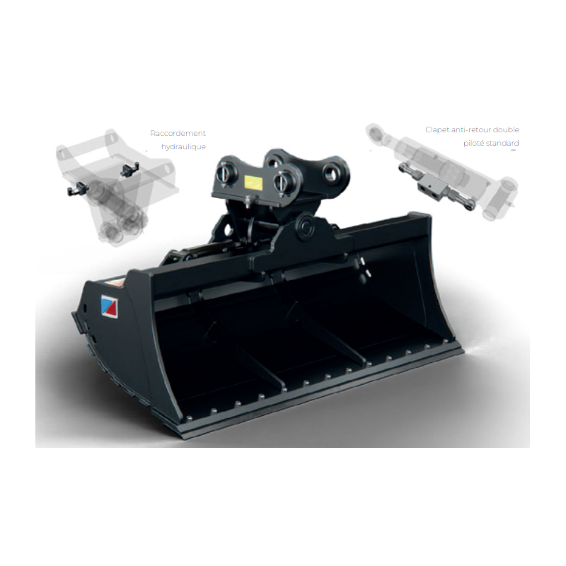 Chaque godet est équipé de vérin double effet permettant une inclinaison à 2 x 45° protégé par un clapet anti retour pour un meilleur maintient de l'angle.