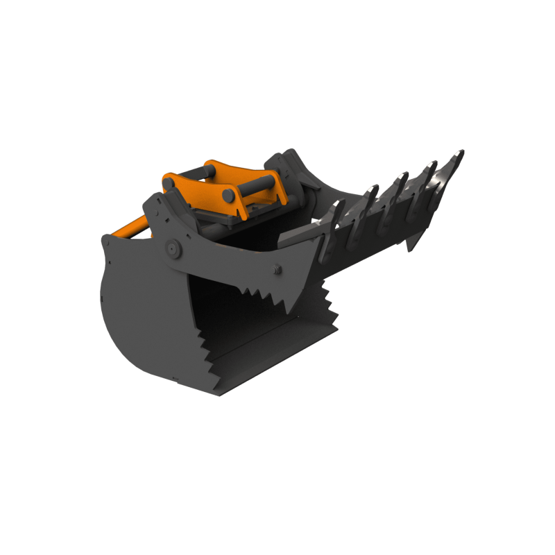 Adaptés au chargement et à la manutention, les côtés dentés du godet 4 en 1 Cangini sont conçus pour faciliter la préhension et le confinement du matériau pendant le déplacement.
